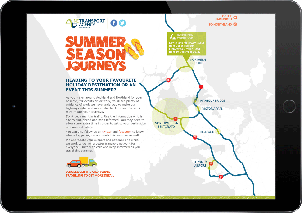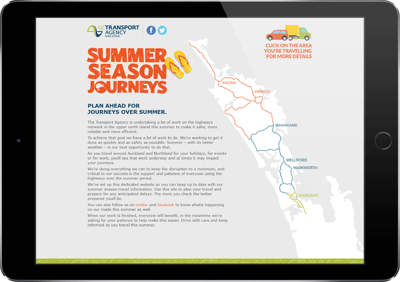 RESULT – As a result of the potential congestion across such a broad area, specific targeting and communication channels were established in the most effected areas, including Kaitaia, Paihia, Whangarei, Dargaville, Warkworth, Auckland and Coromandel. The online products were crucial in ensuring accessability for all road users and holiday makers to where closures and roadworks were.